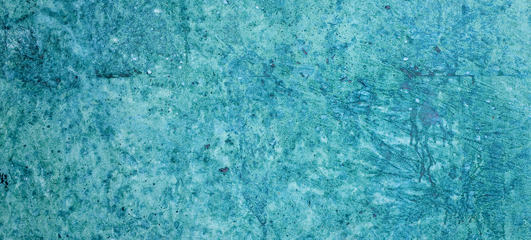 A blue and tan frayed piece of fabric in front greenish blue backgroundof a
